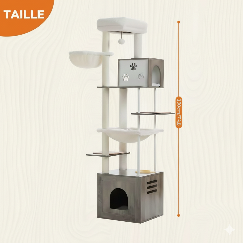Cette structure est un arbre à chat multi-niveaux de grande hauteur, atteignant 190 cm. Elle est principalement composée d'éléments de type bois grisé pour les niches et d'un revêtement de sisal clair pour les poteaux.