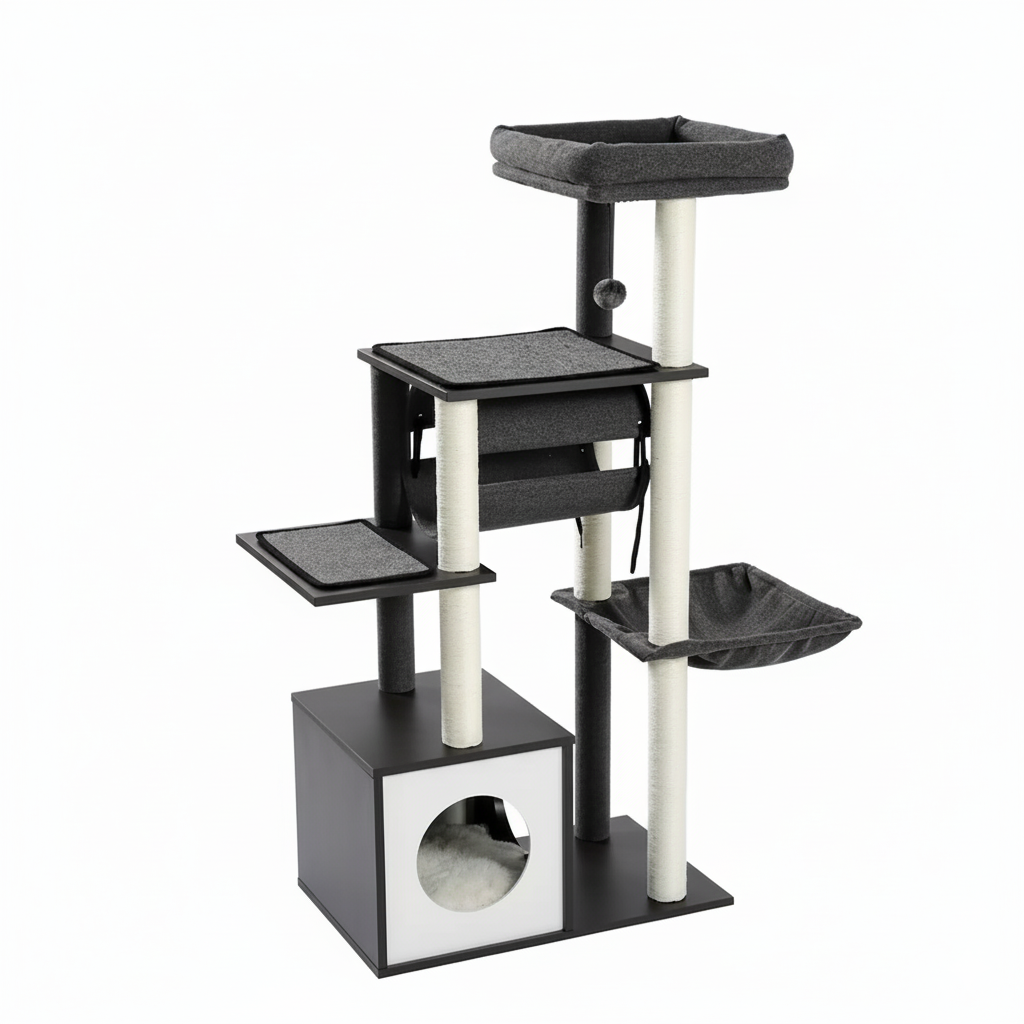 Cette structure pour chat est un arbre multi-niveaux en bois. Elle présente une base en forme de condo cubique fermé qui soutient les niveaux supérieurs. Des poteaux verticaux, recouverts alternativement de corde de sisal blanc et d'un revêtement noir, maintiennent l'ensemble.