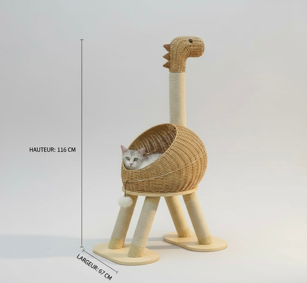 Cette structure pour chat reprend la forme d’un dinosaure avec un panier tressé positionné au centre, soutenu par quatre pieds inclinés recouverts de corde. Le panier constitue la zone principale où le chat peut entrer et se placer. Une colonne verticale s’élève au-dessus du panier et se termine par une tête décorative, ajoutant un élément visuel à l’ensemble. L’accès se fait par l’ouverture avant du panier.
