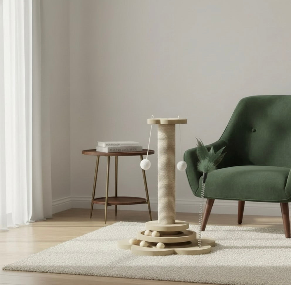 Poteau de griffage : mât central recouvert de corde de sisal tressée.